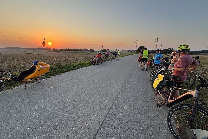Am 12.8. lockte das gute Wetter einige Radler und Radlerinnen zur SunSet-Tour im nördlichen Umfeld von Unterschleißheim. Beim ersten Zwischenstopp am Heiglweiher fand sich diesmal in der Gruppe kein Schwimmer, obwohl einige Kinder den See noch “in Betrieb” hielten. Derzweiten Stopp erfolgte dann kurz vor Ende zum Sonnenuntergang auf einer kleinen Anhöhe mit einem schönen Ausblick.